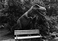 ławką w parku postać dinozaura, a wcześniej, w innych cyklach, barwne