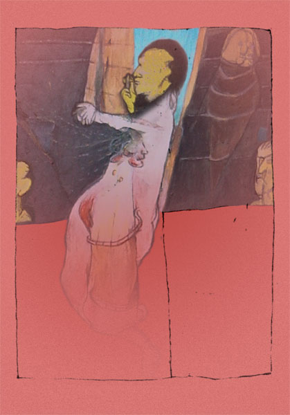 Z zarysami ludzkich sylwetek sąsiadują strefy płaszczyznowo wypełnione barwami. Charakter wizerunków