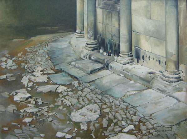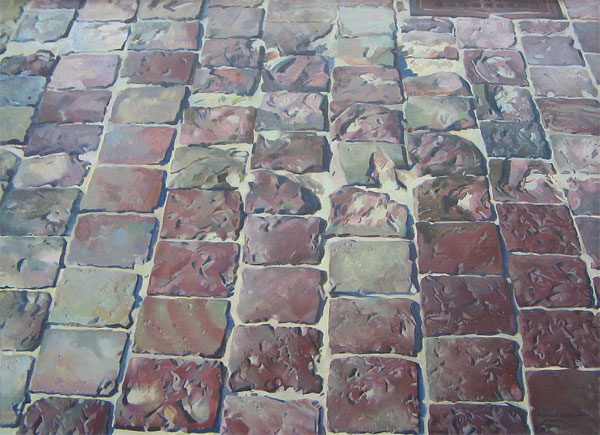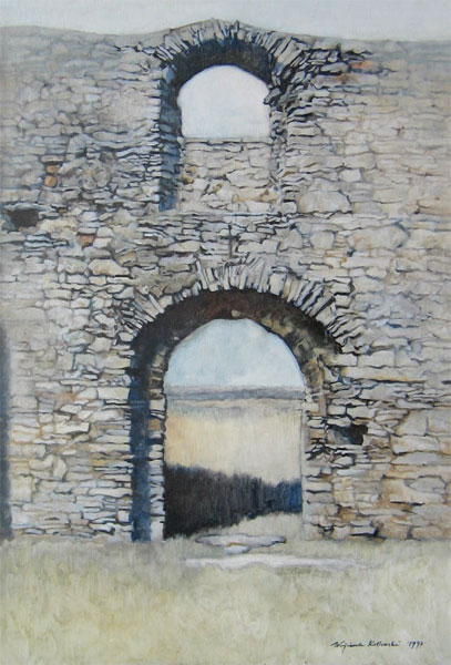 Kamień, który trwa dłużej niż ludzkie życie, cierpliwie przechowuje zarówno radosną, jak i bolesną pamięć o pokoleniach. Faktura naszych losów bywa tak samo chropawa jak powierzchnia starych bruków i murów, jak bruzdy na twarzach portretowanych. Wojciech Kotlewski maluje swoje obrazy z ogromnym szacunkiem dla przeszłości. Dlatego nawet najbardziej banalnych składników rzeczywistości nie odwzorowuje tylko tak, jak się maluje zwykły pejzaż czy martwą naturę, on je maluje tak, jak się pisze ważny dokument.