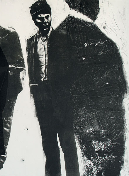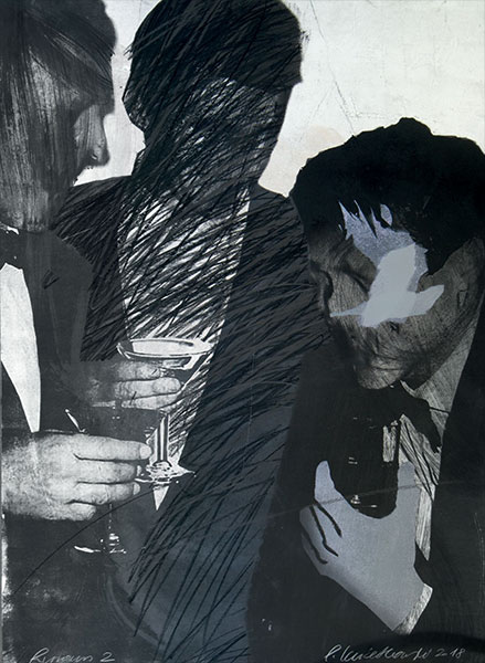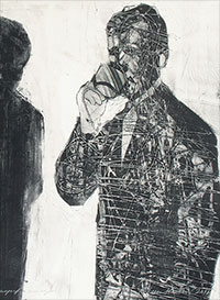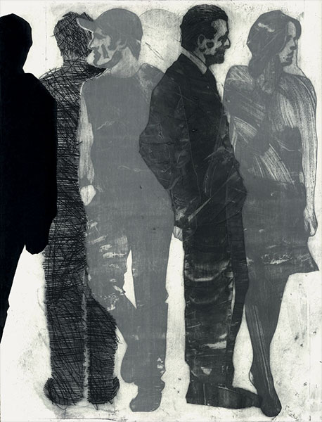 Wizerunki niektórych postaci powtarzają się w różnych pracach, wchodzą w nowe relacje w kolejnych kompozycjach. W niektórych przypadkach takie „szablony” bywają zwielokrotnione, ukazane z różnych punktów widzenia (en face, z profilu, odwrócone plecami), oddane przy tym przy użyciu różnych technik graficznych. Nie zawsze dostrzegamy, że chodzi o tę samą postać, tak jak nie jesteśmy w stanie uchwycić wszystkich aspektów czyjejś osobowości, stanów i kondycji, nie możemy poznać kogoś do końca. W planie formalnym podobne zabiegi kształtują zróżnicowany rytm kompozycji, wyznaczany przez układ postaci, ich pozy i gesty.