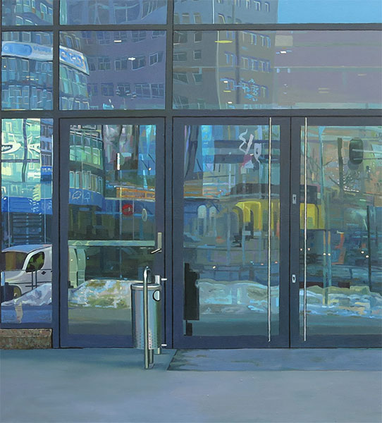 w odbitych w szybach widokach biurowców, połyskujących