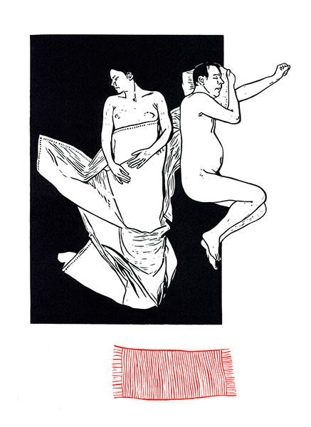 Znów uderza nas w nich szczególna „banalność” opowiadanej historii, wyrażająca się poprzez niepełność i przeciętność zarysowanych sytuacji, ludzi i przedmiotów, pozorny brak skrytych za nimi emocji. Uproszczone sylwetki postaci oddane zostają jedynie za pomocą linii, konturu, bądź płaszczyzn pozbawionych identyfikujących szczegółów. Obraz oddziałuje na nas podobnie jak w przypadku pejzaży – liczy się synteza wyjściowej sytuacji, jej uproszczenie, atmosfera i nastrój. Postaci przemawiają do nas pozami, w jakich zastygły, sugestywnymi gestami (jak choćby w graficznych Konstelacjach czy Odbiciach). Obiekty często wyeksponowane zostają na neutralnym podłożu. Mocno wybijają się z tła, silnie manifestują swoją obecność i niesione znaczenia.