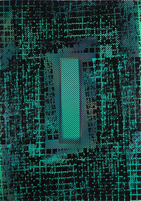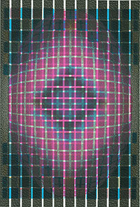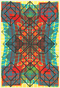 wykorzystuje złożone układy wzorów i barw, tworząc iluzje wielowarstwowych przestrzennych