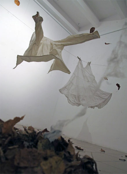 Niektóre z tych działań (takich jak choćby wymownie utrwalająca i odbijająca przeszłość tkanina książkowa) przywołują pomysły artystów reprezentujących nurt arte povera, a także surrealistów (ready made objects). Na granicy podobnych idei leży konceptualna w zamyśle martwa natura złożona z kieliszków i rozlanych (w istocie wykonanych z tworzywa) plam wina. Utrwalone w ten sposób echo jakiegoś spotkania, tamta atmosfera, cisza i napięcie przypominają podobne w nastroju kompozycje małych mistrzów holenderskich, tworzących obrazy procesu przemijania, zwracających uwagę na nietrwałość rzeczy, potrafiących równocześnie zatrzymać wspomnienie intrygującej chwili. Ten aspekt stał niewątpliwie u źródeł innej instalacji,wspomnianej na początku tej wypowiedzi. Ubrania, wyglądające jakby dopiero co wyjęto z nich ludzi, wiszą na sznurze od bielizny targane wiatrem. Na dole wirują w powietrzu liście, wznosi się do góry dym z ogniska. Autorka stworzyła materialny, trwały wyraz rzeczy ulotnych i chwilowych, takich jak wiatr czy dym, zjawisk nieuchwytnych zmysłowo, takich jak przemijanie i pamięć.