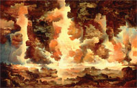 Pejzaże są w większości bezludne, jakby człowiek nie zasługiwał na to, aby mierzyć się z nieujarzmioną mocą natury. Ludzka obecność manifestuje się tylko w śladach zakłóconego majestatu przyrody. Wydeptane dawno ścieżki wiodą do pogruchotanych mostów. Relikty architektury, dumne, mitologizowane niegdyś pomniki potęgi człowieka: piramidy, obeliski i wieże pomieszanych języków brzmią głuchym rezonansem w zaczarowanej przestrzeni. Ślady przykrej porażki w "walce natury z kulturą", natury, która swoimi korzeniami wdziera się w substancję cywilizacji i rozsadza ją mocą swej energii. Artysta nie odwołuje się do tematów literackich, nie skupia się na anegdocie. Stara się oddać wewnętrzną istotę przedmiotów, ducha rzeczy i ducha otaczającej je atmosfery. Tworzy symboliczny, uniwersalny portret przyrody, a przy tym skupia się na wyrażeniu czystych pojęć abstrakcyjnych takich jak: podziw, niepokój, groza czy moc. Świat, mimo że fantastyczny, wykreowany, ma walor trwałości i w pewien sposób staje się uniwersalnym modelem świata żywiołów w ogóle - rodzajem swoistego "pejzażu bohaterskiego", który jednak nie towarzyszy, jak to bywało w historii malarstwa, dokonaniom człowieka, a stanowi pean dla upersonifikowanej natury i jej mocy kreacyjnych.