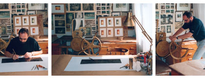 Punktem wyjścia dla malarskich przecież kompozycji staje się grafika. Mezzotintowa odbitka, niczym kanwa czy szkielet konstrukcji zapełnia się stopniowo plastyczną treścią. Fragmenty podkładu znikają stopniowo pod warstwami farby akrylowej, akwareli czy gwaszu, pod naklejanymi płaszczyznami papieru, pod warstwami laserunków i lakierów. Warsztat artysty mierzy się z nowymi doświadczeniami, obserwacja współdziałania poszczególnych składników dzieła w różnych konfiguracjach dostarcza kolejnych satysfakcji - zaskakuje bądź potwierdza słuszność podjętych warsztatowych decyzji. Rodzi się nowa jakość. Artysta sięga samej istoty plastyczności, a przy tym, co wydaje się być najważniejsze, dotyka skomplikowanych relacji między tym co graficzne, a tym co malarskie.