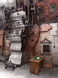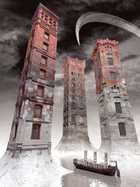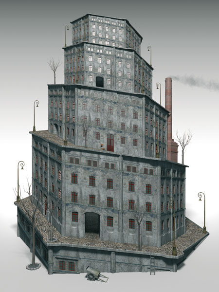 Ale jest w tych obrazach upadającego miasta, a szczególnie w łódzkich Ostańcach także inny akcent. Wille, kościoły, cmentarze, okazałe mury fabryczne, to, co zostało w łódzkim krajobrazie jako symbol - choćby tylko pozornej - świetności, zostaje zmitologizowane (nie bez poczucia humoru) i zmonumentalizowane. Artysta z reliktów przemysłowej cywilizacji czyni katedrę, buduje ołtarz. Mnoży skojarzenia: piramidy, krzywa dzwonnica w Pizie, Sagrada Familia Gaudiego i ... Wieża Babel. Wśród zaułków wielokulturowego labiryntu dumnie pnie się w górę ceglana menora, wypina brzuch gigantyczny samowar, trzepoczą husarskie pióra przypięte do fabrycznych murów. Czy to obraz przebrzmiałej dumy, podobnie jak pawi ogon z tkackich czółenek? Czy tak dziś, jak i kiedyś - to jedynie eksponaty z łódzkiego panopticum? A może - jak mawia sam autor prac - to tylko 100% surrealizmu? Daniel Zagórski chętnie przywołuje w odniesieniu do swoich prac nazwę tego artystycznego kierunku. Obrazy Zagórskiego są surrealistyczne w tym sensie, że rzeczywistość w nich ukazywana jest tak zaskakująca i czasami absurdalna, że wydaje się być nie do uwierzenia i nie do zaistnienia.