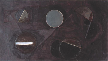 Obraz brązowy z kołami, olej, tektura, 50x87,5, 1958