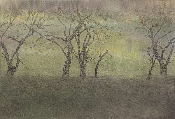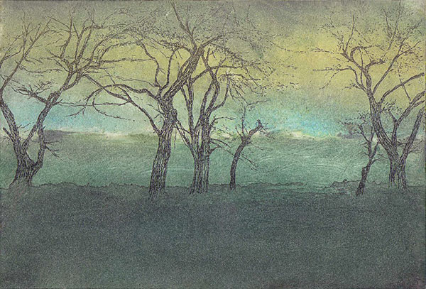 akwaforta. Wizerunki drzew wprowadzają w pejzaż elementy ruchu