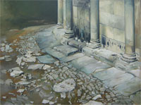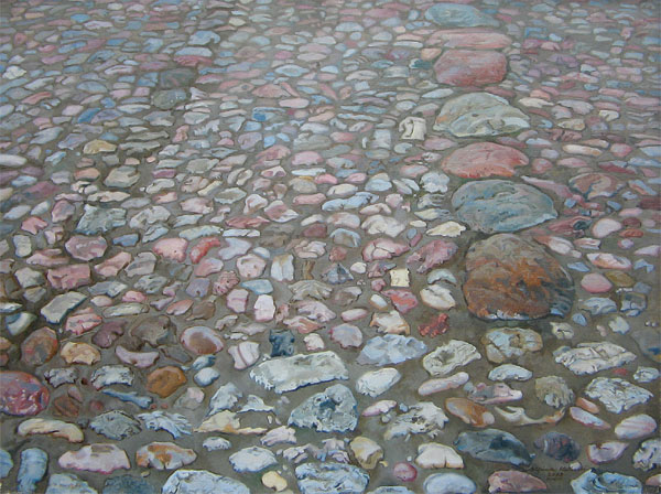 Dlatego refleksję artystyczną i filozoficzną Wojciecha Kotlewskiego należy traktować całościowo: malarstwo, w trosce o pełnię przekazu, wzbogacone zostaje o ślady materialne miejsc, o pamięć i wspomnienia jego oraz innych ludzi, o szkice, notatki i inskrypcje. Dopiero wtedy możliwe staje się obcowanie z całokształtem losów i historii, których tylko śladem są namalowane wizerunki murów, obrazy przemierzanych przez pokolenia dróg, przedstawienia leśnych ostępów. Można by w tym miejscu przypomnieć, że natura, otoczenie człowieka bywa tematem malarstwa bardzo często. O ile jednak zazwyczaj jej elementy ukazywane są w sztuce z perspektywy "ekologicznej", to w twórczości Wojciecha Kotlewskiego jest obecna przede wszystkim historia. Zbiór kamieni przywożonych z religijnych sanktuariów oraz, na przykład, ze stron rodzinnych, są oczywiście pamiątkami z pobytu w tych miejscach osób współczesnych, samego artysty albo jego przyjaciół, ale są także, na kolejnym poziomie, śladami życia i losów innych ludzi, nieraz z odległej przeszłości, śladami tych, co budowali romańskie świątynie, jak w Wąchocku (gdzie notabene zachował się na kamiennej ścianie gmerk średniowiecznego mistrza, jego wizytówka, świadectwo obecności), śladami tych, co wznosili zamki, jak w Mirowie na Jurze, tych, co kroczyli w procesjach po Trakcie Królewskim w Krakowie i wreszcie tych, co podążali w swą ostatnią podróż, wystukując chodakami rytm po bruku obozu w Oświęcimiu. Dziś stare bruki wymienia się na nowe, albo - choćby z oszczędności - przenosi nawierzchnię z innych miejsc, burząc kolej historii utrwalonej w kamieniu. Nawierzchnię ulicy Dolnej w Łodzi, tam, gdzie przebiegała granica Litzmanstadt Ghetto, zalewa się asfaltem. Dziedziniec jasnogórski w Częstochowie wyłożono, po usunięciu starej kostki, kamieniem z modernizowanej Alei... Lenina.
