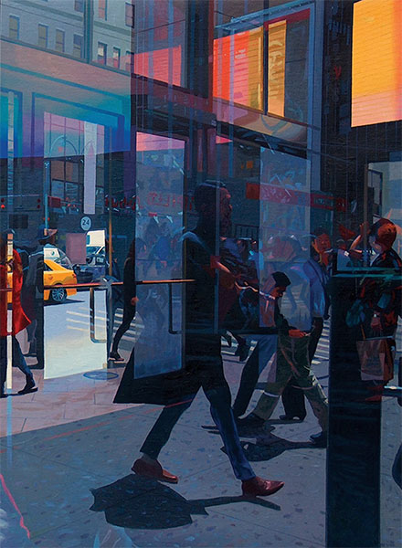 w odbitych w szybach widokach biurowców, połyskujących