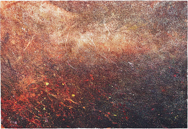 mieszają się z atomami powietrza, ziemia ulega żarowi ognia. Artysta kreuje obraz zderzenia