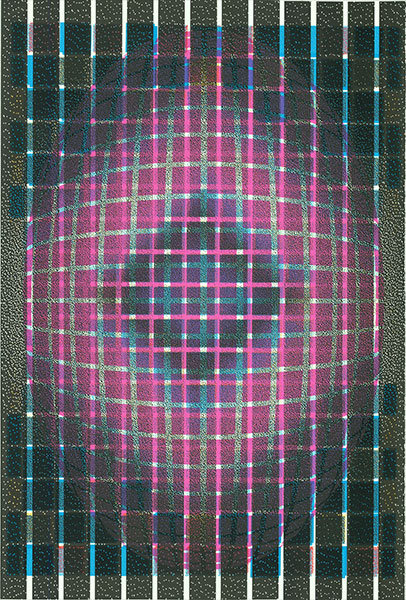 wykorzystuje złożone układy wzorów i barw, tworząc iluzje wielowarstwowych przestrzennych
