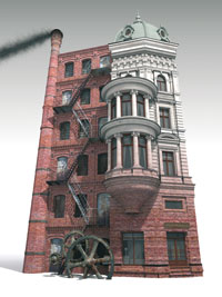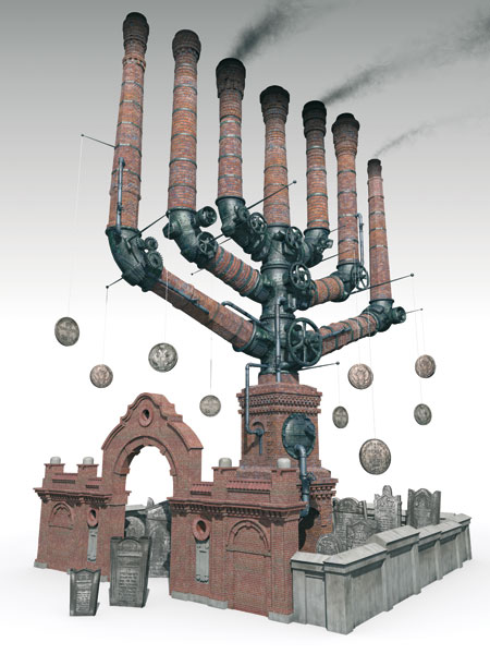 Ale jest w tych obrazach upadającego miasta, a szczególnie w łódzkich Ostańcach także inny akcent. Wille, kościoły, cmentarze, okazałe mury fabryczne, to, co zostało w łódzkim krajobrazie jako symbol - choćby tylko pozornej - świetności, zostaje zmitologizowane (nie bez poczucia humoru) i zmonumentalizowane. Artysta z reliktów przemysłowej cywilizacji czyni katedrę, buduje ołtarz. Mnoży skojarzenia: piramidy, krzywa dzwonnica w Pizie, Sagrada Familia Gaudiego i ... Wieża Babel. Wśród zaułków wielokulturowego labiryntu dumnie pnie się w górę ceglana menora, wypina brzuch gigantyczny samowar, trzepoczą husarskie pióra przypięte do fabrycznych murów. Czy to obraz przebrzmiałej dumy, podobnie jak pawi ogon z tkackich czółenek? Czy tak dziś, jak i kiedyś - to jedynie eksponaty z łódzkiego panopticum? A może - jak mawia sam autor prac - to tylko 100% surrealizmu? Daniel Zagórski chętnie przywołuje w odniesieniu do swoich prac nazwę tego artystycznego kierunku. Obrazy Zagórskiego są surrealistyczne w tym sensie, że rzeczywistość w nich ukazywana jest tak zaskakująca i czasami absurdalna, że wydaje się być nie do uwierzenia i nie do zaistnienia.
