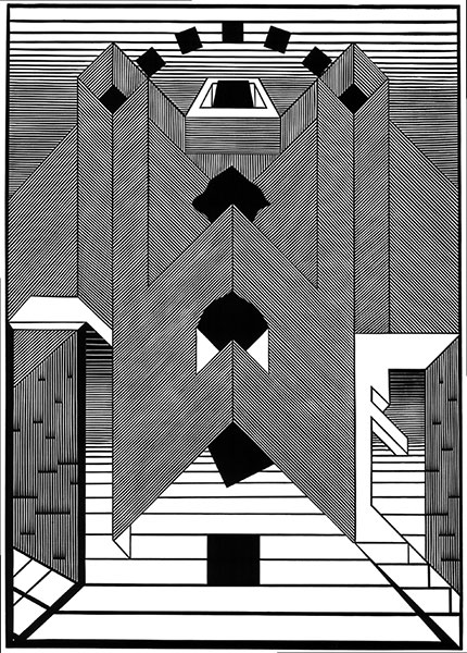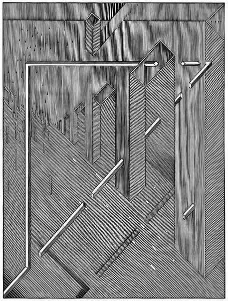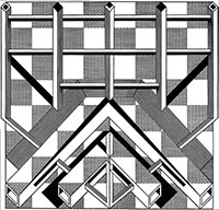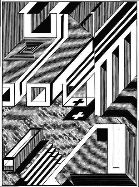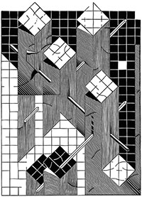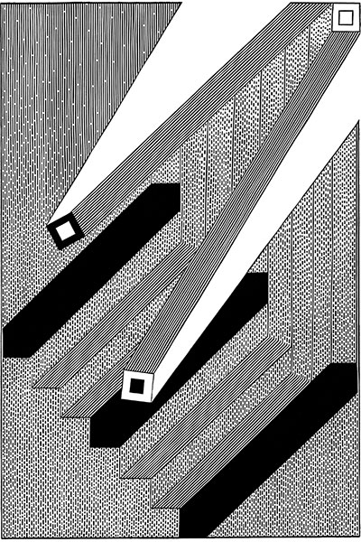 sieciami tajemniczych instalacji. Przekaz wzbogacają figury geometryczne,